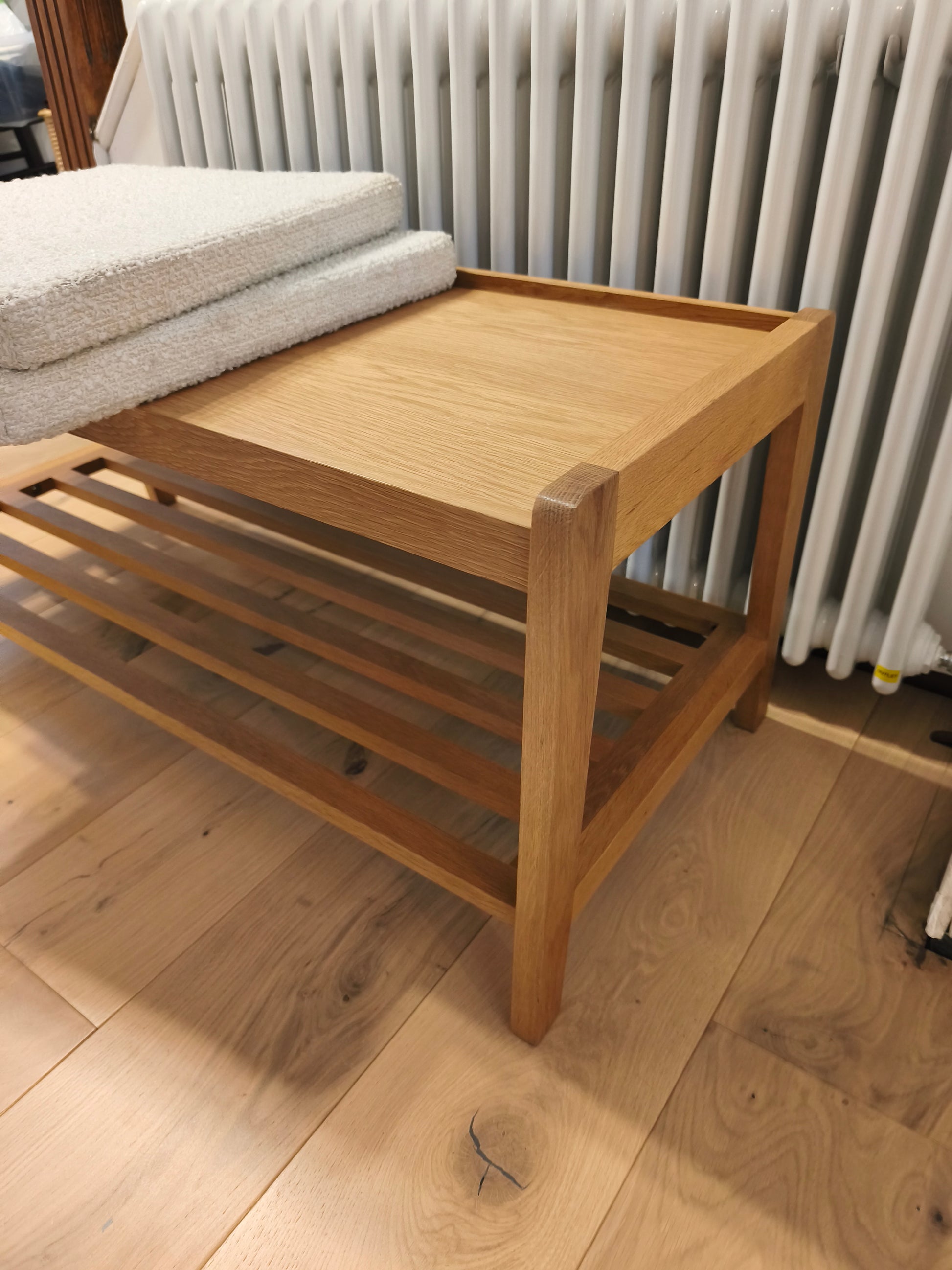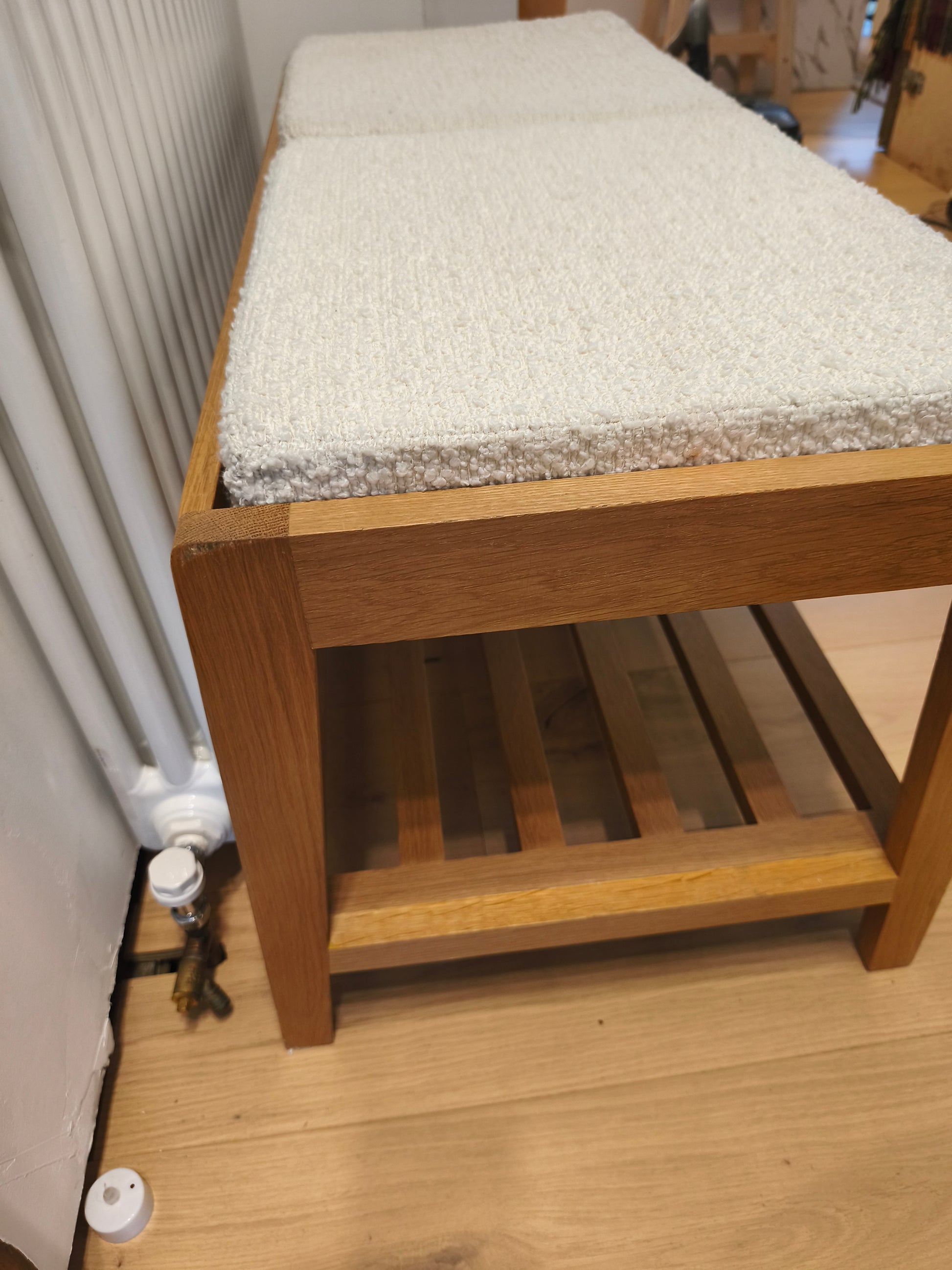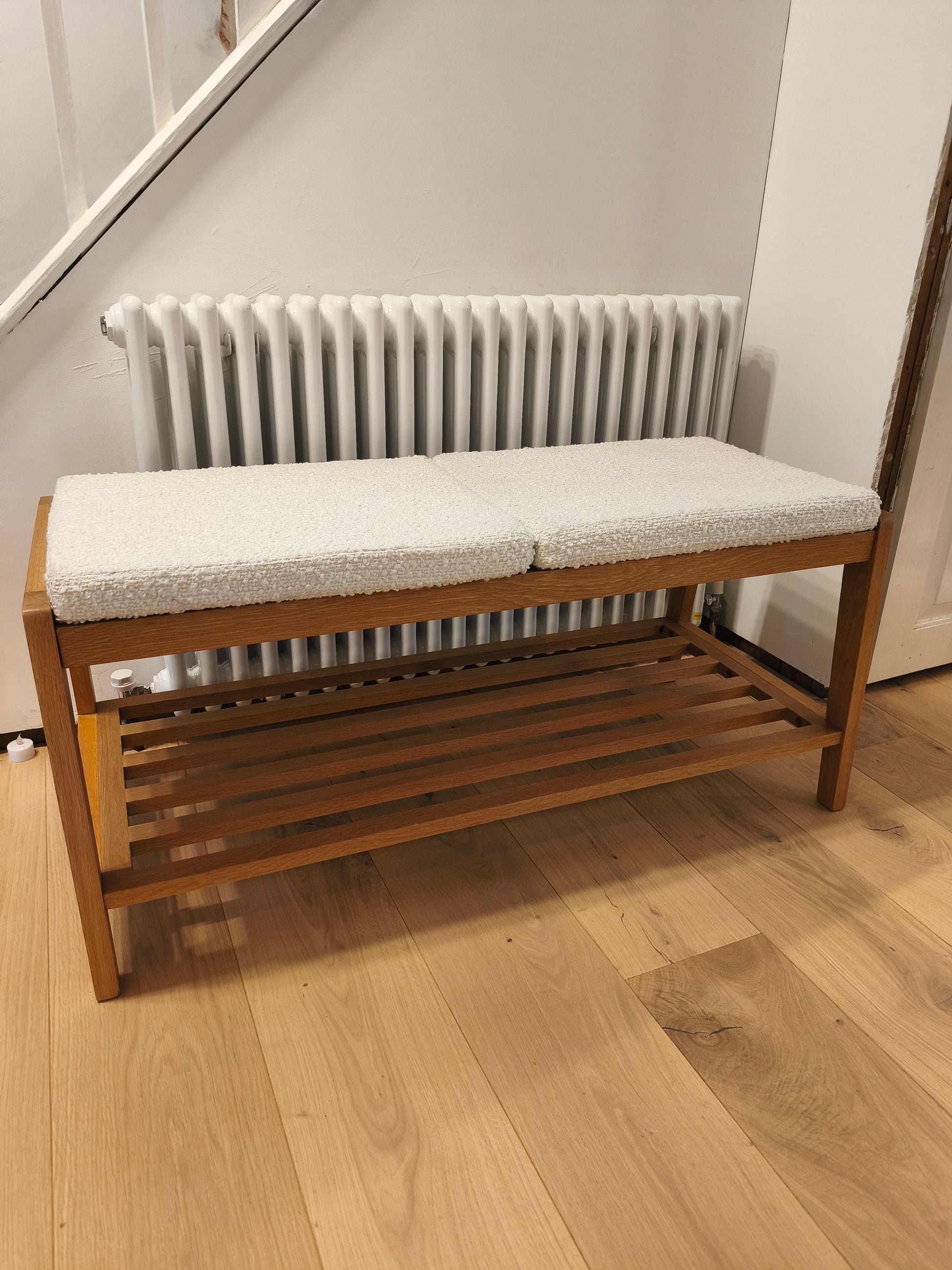 Solid Oak Hallway Storage Bench with boucle style cushions and extra shelf under
